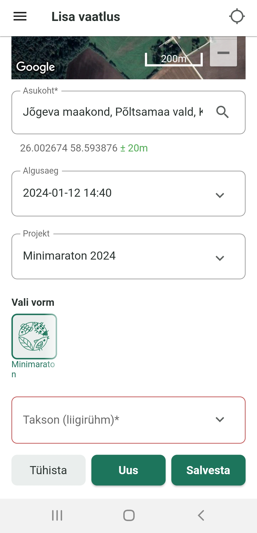 NB! Vaatluse saatmiseks minimaratonil peab olema täidetud projektiväli: "Minimaraton 2026". Projekt leitakse otsingu kaudu, selleks peaks olema seade internetis.