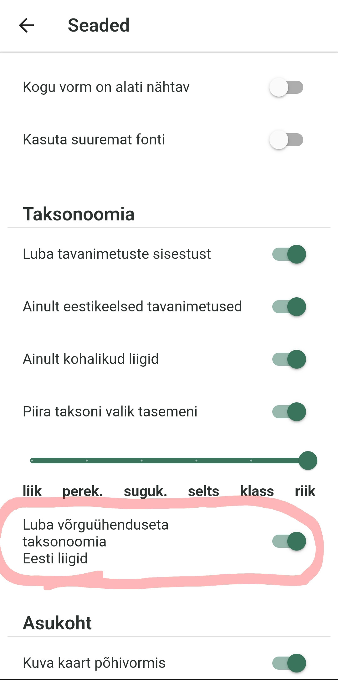 Määrangu lisamisel tuleb liiki otsida taksoni menüüst. Selleks, et seda toimingut saaks ka ilma internetita teha, soovitame seadetest alla laadida Eesti liikide nimekiri.